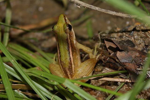 1909年,美國爬蟲類學家約翰・范・丁柏格(John Van Denburgh),在臺北八里地區發現一種體型嬌小如拇指大的青蛙,並將其命名為臺北赤蛙。臺北赤蛙常見於臺灣西部低海拔沼澤、埤塘、水田或灌溉溝渠等濕地環境,只要有牠在,就能證明當地水質良好,因此被農民認為是水質的守護神。牠的體型大約是2~4公分,背部顏色多為綠色、黃綠色,身體兩側各有2條鮮明的金白線。臺北赤蛙的繁殖期主要在3~8月,這段時間牠喜歡待在池塘、沼澤等有水的地方,非繁殖時期則是躲藏在池塘、沼澤附近的草叢或樹林間。牠們的蛙鳴聲小,也不會大合唱,平時不太會引起大眾的注意。近數十年來,臺北赤蛙數量急速減少甚至瀕臨絕種,本來隨處可見...